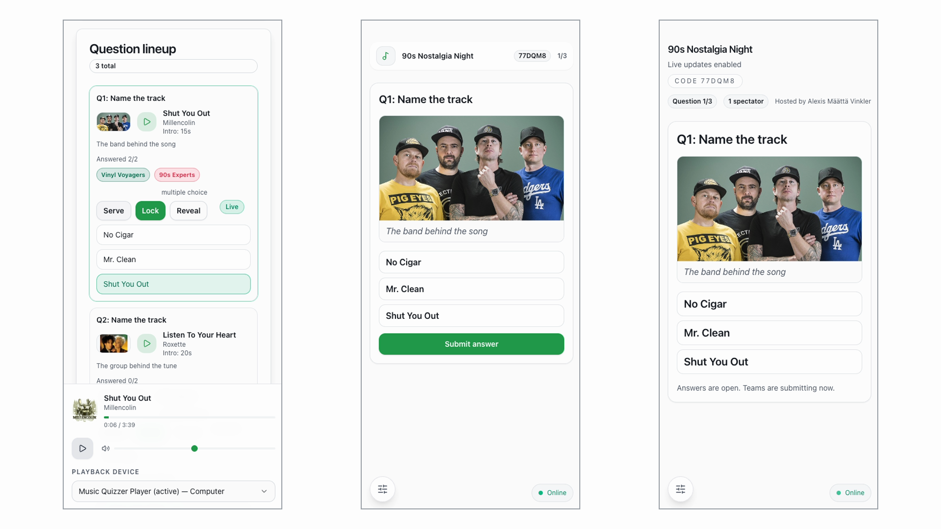- Room pacing control for serving questions, locking answers, and triggering reveals.